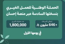 الحملة الوطنية للعمل الخيري في نسختها السادسة تتجاوز 646 مليون ريال في يومها الأول