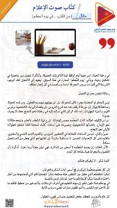 في رحلة الحياة، تمر علينا أيام توقظ فينا الذكرياتالجميلة، وتُذكّرنا بفضل من ساهموا في تشكيل وعينا، ويأتي “يوم المُعلِّم” كمنارة في هذا السياق؛ ليعيد إلى الأذهان تلكالوجوه الكريمة التي أضاءت دروب المعرفة أمامنا، وساهمت في كل إنجاز نحققه.