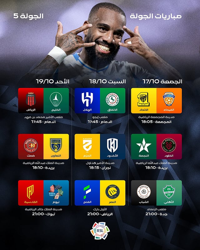 تدور عجلة دوري روشن السعودي للمحترفين مساء اليوم الجمعة مجددًا مع انطلاق الجولة الخامسة، التي تشهد مواجهات قوية وتنافسًا متصاعدًا بين أندية الصدارة، في ظل سعي الفرق لتعزيز مواقعها وجمع النقاط الكاملة قبل الدخول في المرحلة المتقدمة من الدور الأول.