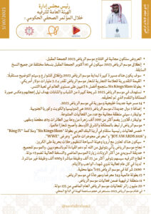 كما أعلن أن القيمة السوقية لشعار موسم الرياض بلغت 3.2 مليار دولار، مؤكدًا أن الموسم هذا العام سيركز بشكل أكبر على المحتوى المحلي، تعزيزًا لمكانة المملكة كوجهة عالمية للترفيه والسياحة.