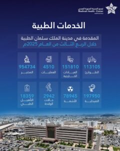 ضمن جهودها المتواصلة لتطوير جودة الرعاية الصحية وتوسيع نطاق الخدمات الطبية لتلبية احتياجات المرضى في مختلف التخصصات، قدمت مدينة الملك سلمان الطبية بالمدينة المنورة خدمات صحية متكاملة لـ264,915 مستفيدًا خلال الربع الثالث من عام 2025.