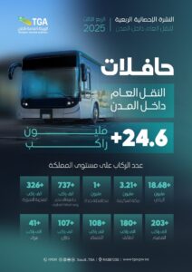 أكدت الهيئة العامة للنقل، تخطى عدد الركاب بالحافلات داخل المدن 24.6 مليون راكب، خلال الربع الثالث من 2025م.
