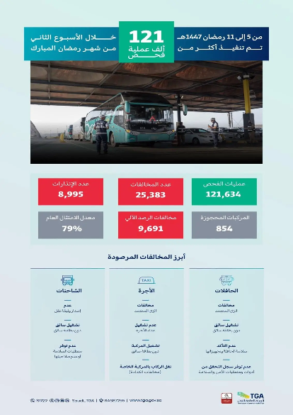 نفَّذت الهيئة العامة للنقل خلال الفترة (5 – 11) من شهر رمضان الجاري أكثر, (121,634) عملية فحص نتج عنها رصد (25,383) مخالفة وحجز (854) مركبة مخالفة بمعدل امتثال بلغ (79%)، في عددٍ من مناطق المملكة وتحديدًا في منطقتي مكة المكرمة والمدينة المنورة؛ لضمان تقديم خدمات نقل آمنة وذات جودة عالية لضيوف الرحمن والمستفيدين.