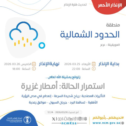رفع المركز الوطني للأرصاد درجة الإنذار إلى اللون الأحمر في منطقة الحدود الشمالية، محذراً من استمرار هطول أمطار غزيرة تشمل مدن عرعر، ورفحاء، والعويقيلة. وأوضح المركز في تحديثه الأخير أن الحالة الجوية المتقدمة تترافق مع تأثيرات مصاحبة شديدة، تتضمن رياحاً هابطة شديدة السرعة، وانعداماً تاماً في مدى الرؤية الأفقية، إضافة إلى تساقط كميات من البرد، وجريان السيول، والصواعق الرعدية القوية.