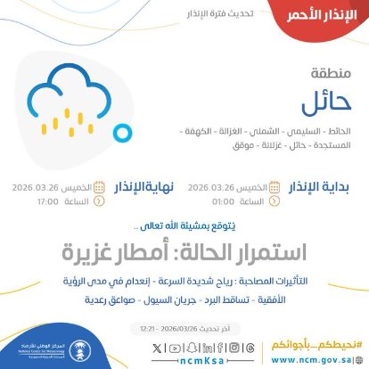 أصدر المركز الوطني للأرصاد تحديثاً لصافرات الإنذار الأحمر في منطقة حائل، محذراً من استمرار هطول أمطار غزيرة تشمل مدينة حائل ومحافظات الحائط، السليمي، الشملي، الغزالة، والكهفة، بالإضافة إلى المستجدة، غزلانة، موقق، الشنان، بقعاء، وسميراء. وأوضح المركز أن هذه الحالة الجوية من المتوقع أن تستمر فترتها حتى مساء اليوم الخميس.