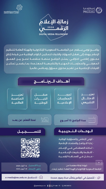 ودعت الجهات المنظمة الراغبين في الالتحاق إلى التسجيل عبر الرابط الإلكتروني المخصص، أو التواصل عبر البريد الإلكتروني e-media@seu.edu.sa، أو من خلال الرقم 920001212، لمزيد من المعلومات.