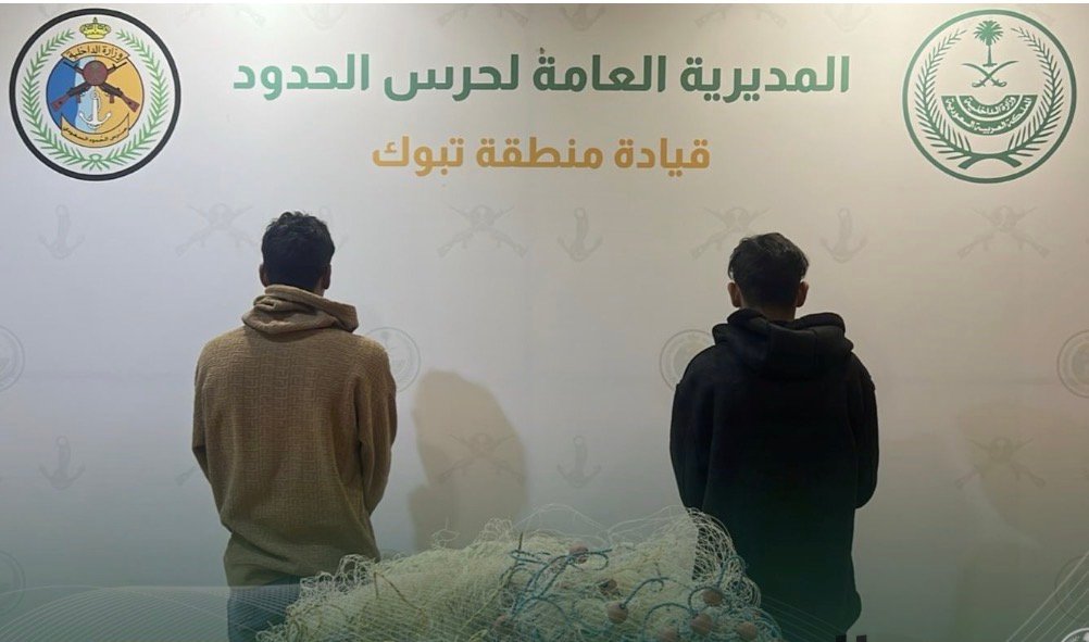 تمكنت دوريات حرس الحدود بمنطقة تبوك من ضبط مواطنَيْن مخالفَيْن للائحة الأمن والسلامة لمزاولي الأنشطة البحرية في المناطق البحرية للمملكة، وذلك لممارستهما الصيد دون تصريح، واستخدامهما أدوات محظورة .