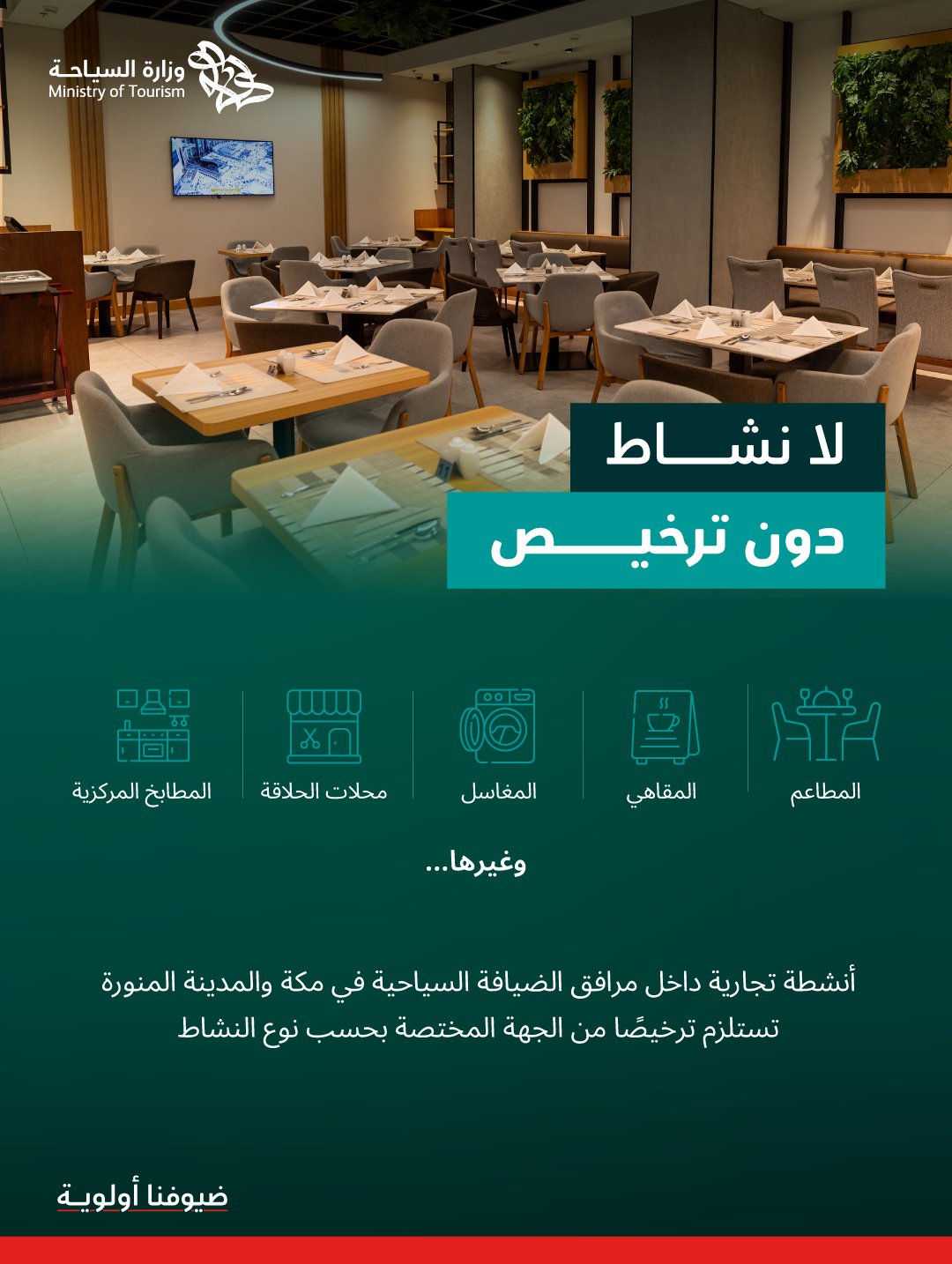 أكدت وزارة السياحة أنه في حال وجود أي نشاط تجاري داخل مرافق الضيافة السياحية في العاصمة المقدسة أو المدينة المنورة، فإنه يتوجب الحصول على ترخيص مستقل من الجهة المختصة وفقًا لنوع النشاط.
