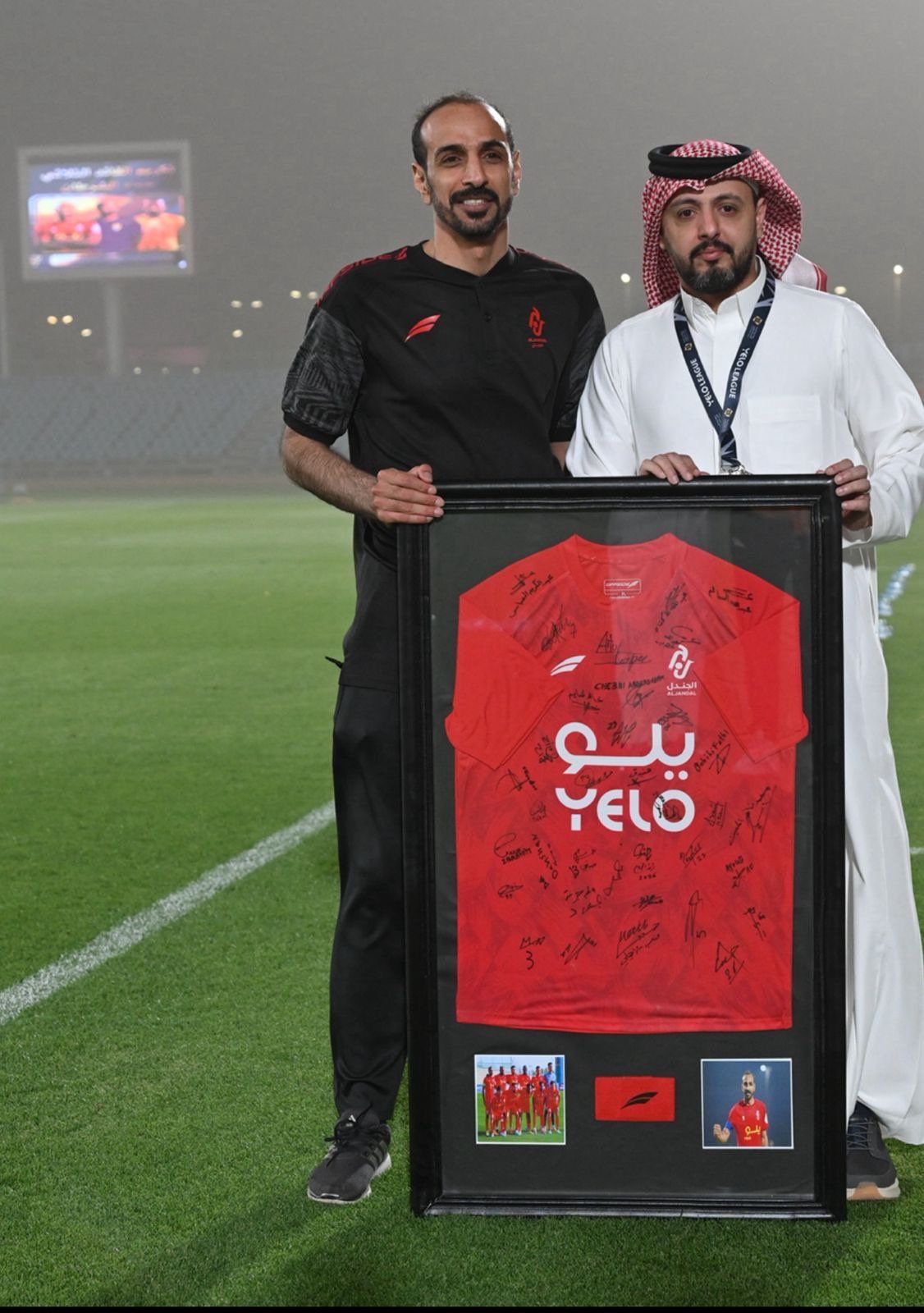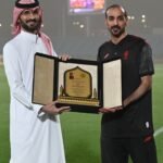 وتزينت ساعة ملعب المباراة بصورة اللاعب حماد الشرطان، مرفقة بشعارات الأندية الثلاثة وعبارة “القائد الثلاثي”، في لفتة تعبيرية جسدت حجم التقدير والاعتزاز بمسيرته.