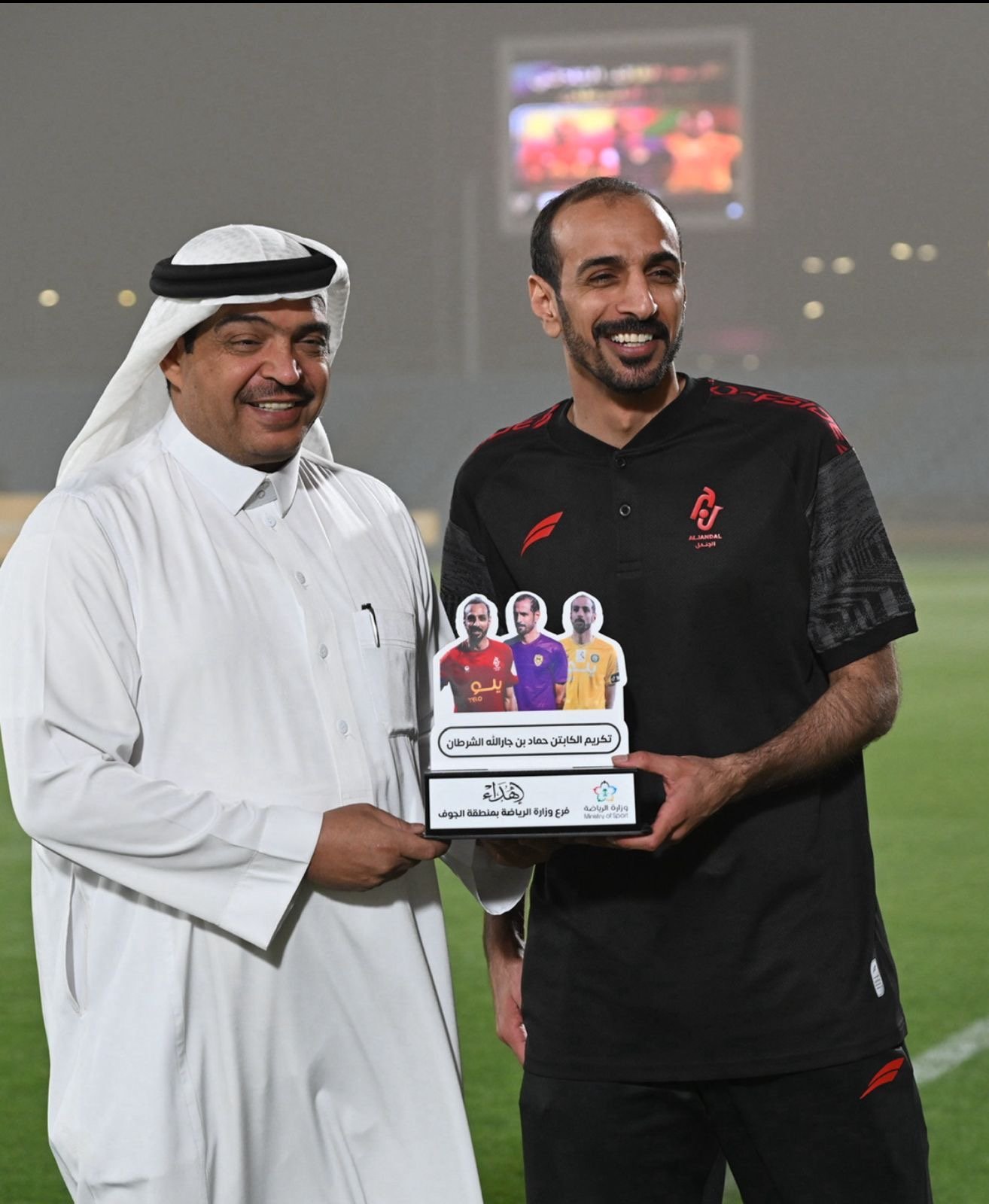 قدم فرع وزارة الرياضة في منطقة الجوف، وبمشاركة أندية العروبة و القلعة و الجندل، تكريماً مميزاً للاعب كرة القدم السابق حماد بن جارالله الشرطان، تقديراً لمسيرته الرياضية الحافلة وإنجازاته اللافتة مع أندية المنطقة.