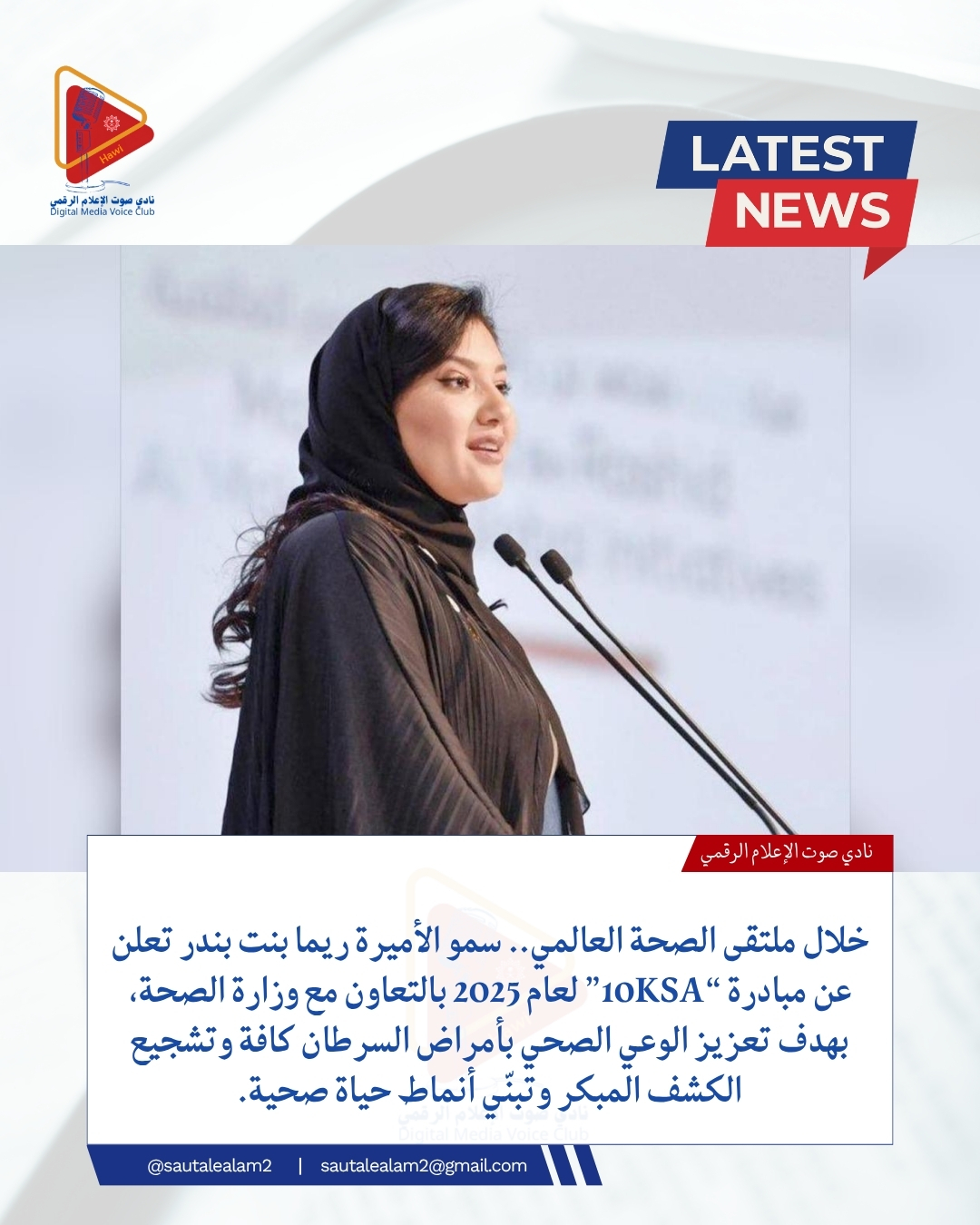 خلال ملتقى الصحة العالمي.. سمو الأميرة ريما بنت بندر تعلن عن مبادرة “10KSA” لعام 2025 بالتعاون مع وزارة الصحة، بهدف تعزيز الوعي الصحي بأمراض السرطان كافة وتشجيع الكشف المبكر وتبنّي أنماط حياة صحية.