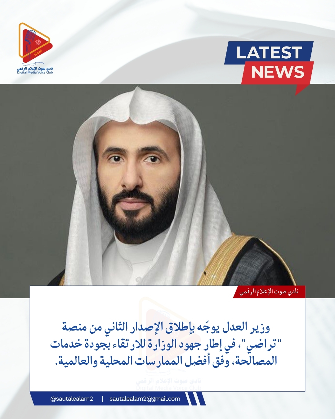 وزير العدل يوجّه بإطلاق الإصدار الثاني من منصة “تراضي”، في إطار جهود الوزارة للارتقاء بجودة خدمات المصالحة، وفق أفضل الممارسات المحلية والعالمية.