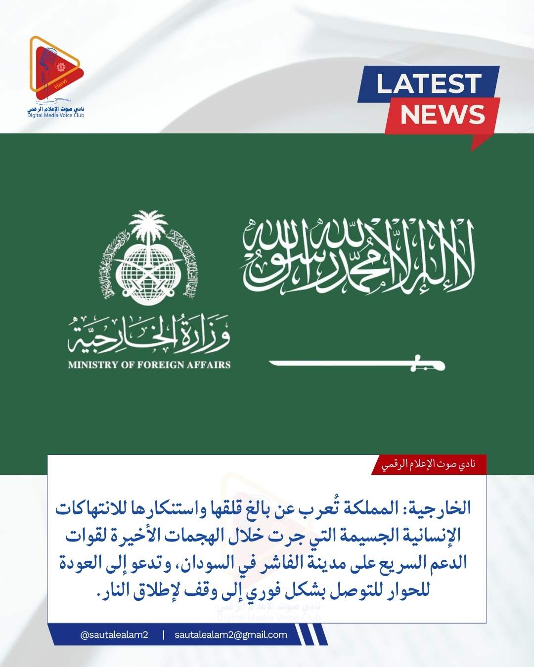الخارجية: المملكة تُعرب عن بالغ قلقها واستنكارها للانتهاكات الإنسانية الجسيمة التي جرت خلال الهجمات الأخيرة لقوات الدعم السريع على مدينة الفاشر في السودان، وتدعو إلى العودة للحوار للتوصل بشكل فوري إلى وقف لإطلاق النار.