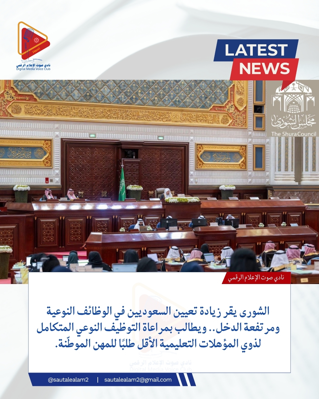 الشورى يقر زيادة تعيين السعوديين في الوظائف النوعية ومرتفعة الدخل.. ويطالب بمراعاة التوظيف النوعي المتكامل لذوي المؤهلات التعليمية الأقل طلبًا للمهن الموطّنة.