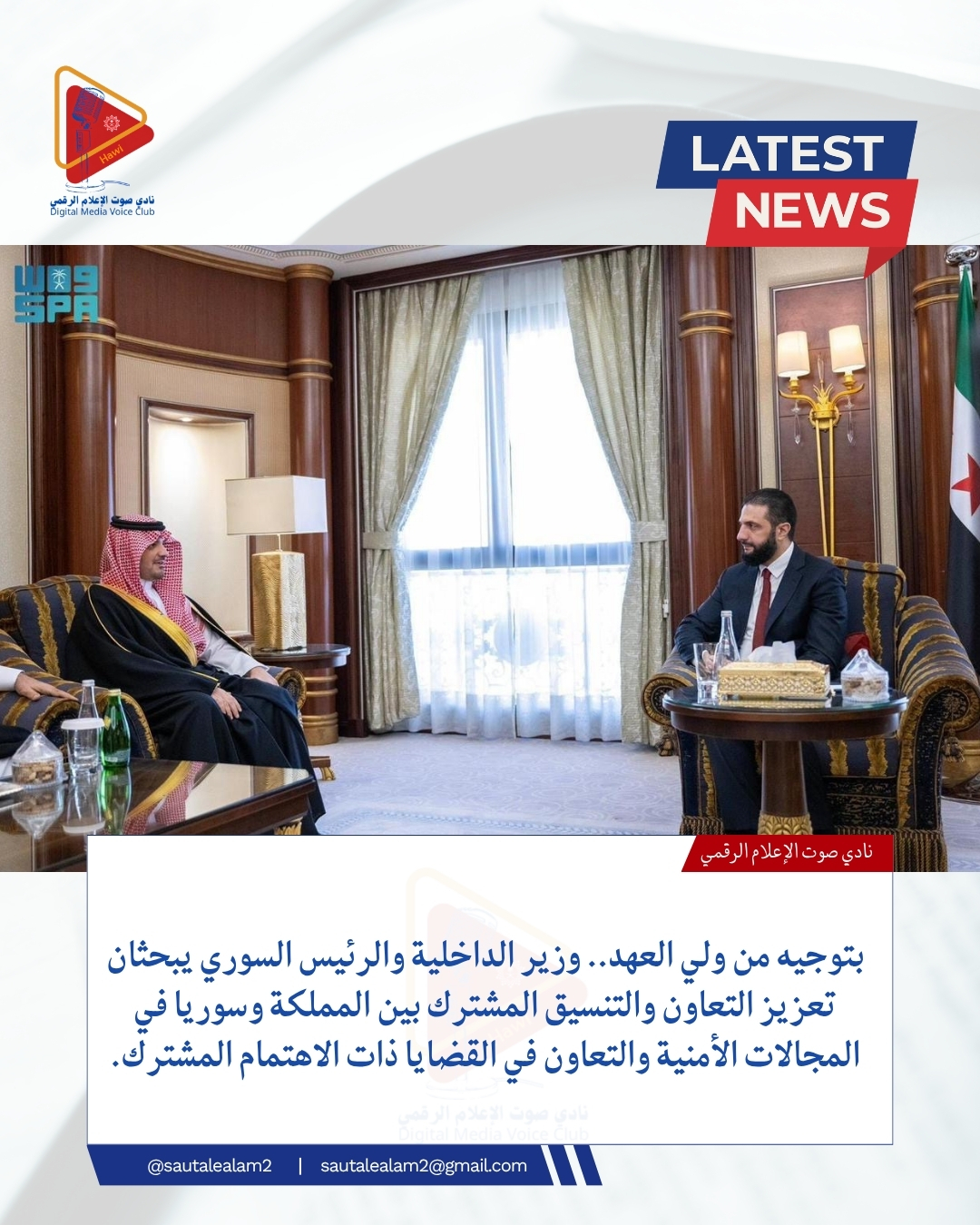 بتوجيه من ولي العهد.. وزير الداخلية والرئيس السوري يبحثان تعزيز التعاون والتنسيق المشترك بين المملكة وسوريا في المجالات الأمنية والتعاون في القضايا ذات الاهتمام المشترك.