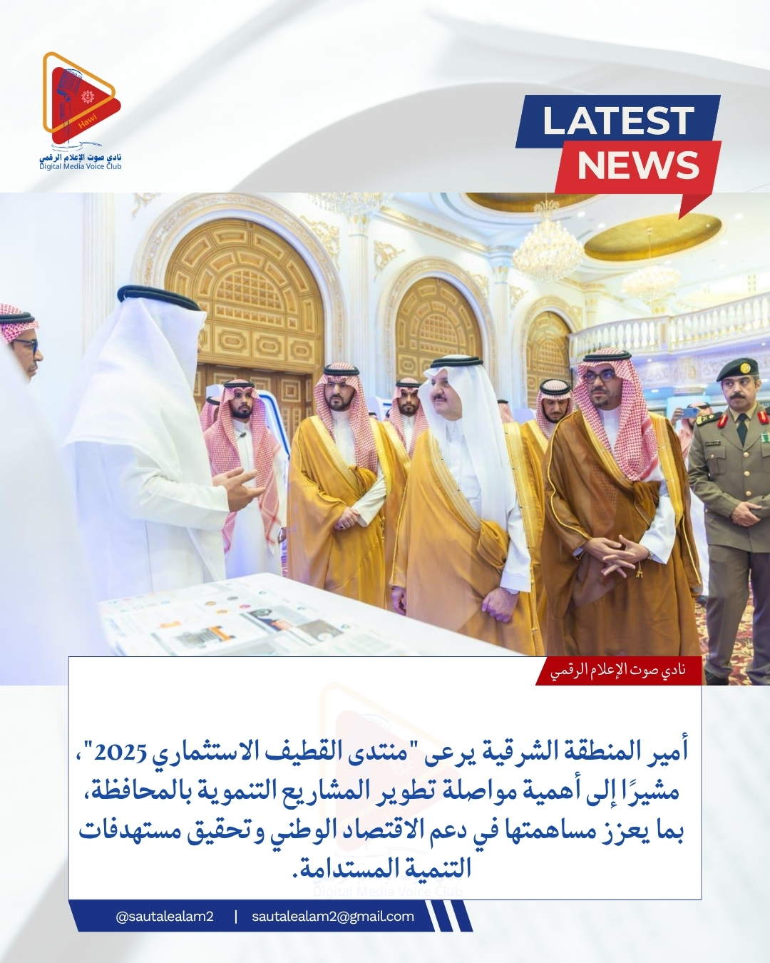 أمير المنطقة الشرقية يرعى “منتدى القطيف الاستثماري 2025″، مشيرًا إلى أهمية مواصلة تطوير المشاريع التنموية بالمحافظة، بما يعزز مساهمتها في دعم الاقتصاد الوطني وتحقيق مستهدفات التنمية المستدامة.