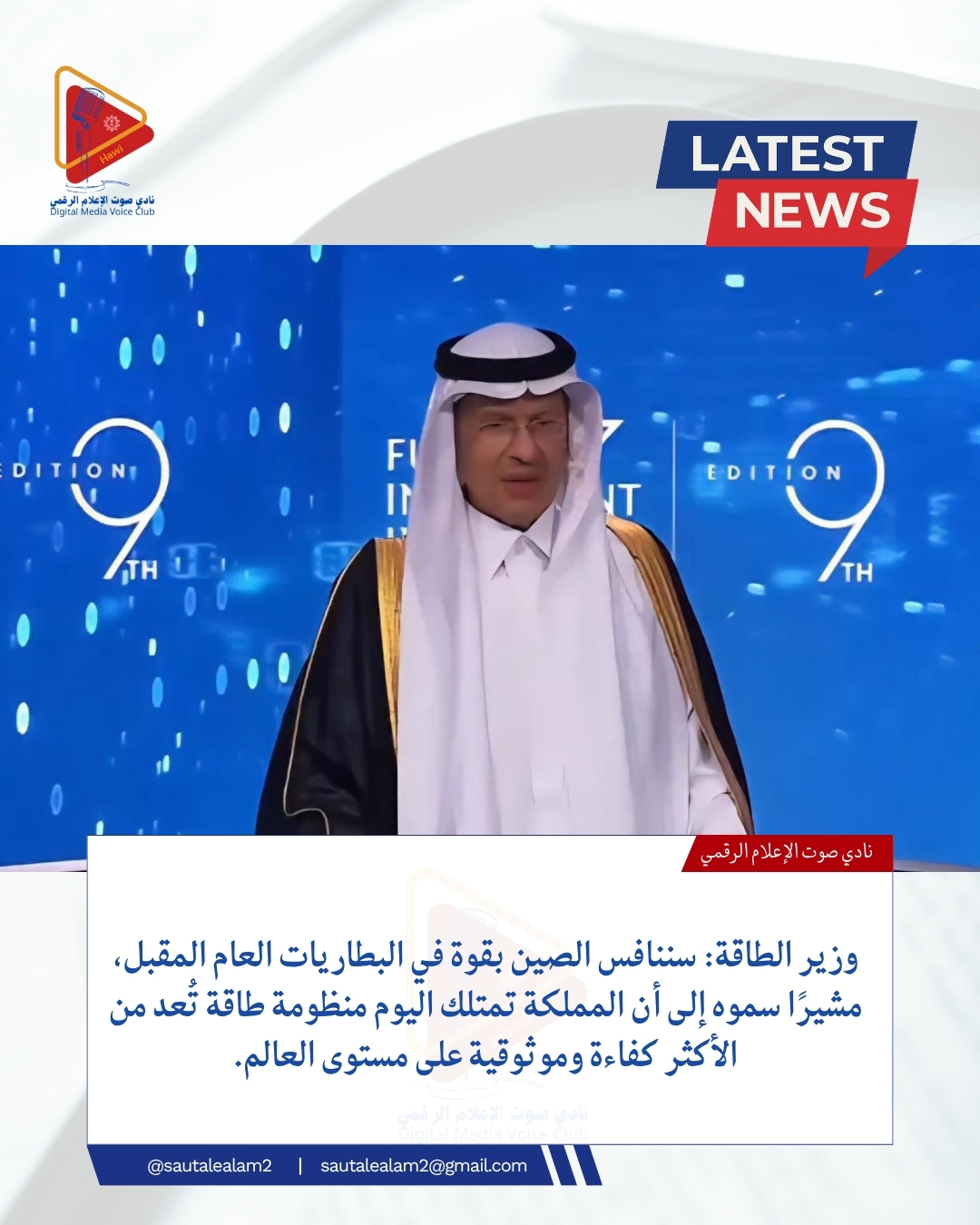 وزير الطاقة: سننافس الصين بقوة في البطاريات العام المقبل، مشيرًا سموه إلى أن المملكة تمتلك اليوم منظومة طاقة تُعد من الأكثر كفاءة وموثوقية على مستوى العالم.