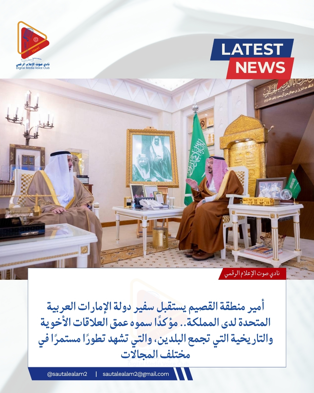 أمير منطقة القصيم يستقبل سفير دولة الإمارات العربية المتحدة لدى المملكة.. مؤكدًا سموه عمق العلاقات الأخوية والتاريخية التي تجمع البلدين، والتي تشهد تطورًا مستمرًا في مختلف المجالات