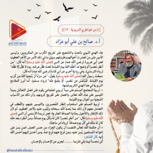 سَمِعْتُ رَسولَ اللهِ (صَلَّى اللَهُ عليه وسلَّمَ) يقولُ: “مَن سَرَّهُ أَنْ يُنْجِيَهُ اللَهُ مِن كُرَبِ يَومِ القِيَامَةِ، فَلْيُنَفِّسْ عن مُعْسِرٍ، أَوْ يَضَّعْ عنْه” (رواه مسلم). أما أبرز الملامح التربوية في هذا الهدي الكريم فمنها: