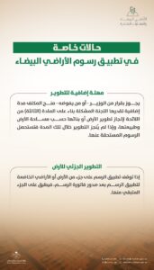وتضمنت الحالات الخاصة في تطبيق رسوم الأراضي البيضاء، حالتين، الأولى “مهلة إضافية للتطوير” حيث يجوز بقرار من الوزير -أو من يفوضه- منح المكلف مدة إضافية تقدّرها اللجنة المشكلة بناءً على المادة (الثالثة) من اللائحة لإنجاز تطوير الأرض أو بنائها حسب مساحة الأرض وطبيعتها، وإذا لم يُنجز التطوير خلال تلك المدة فستُحصّل الرسوم المستحقة عنها.