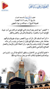 قال خطيب المسجد الحرام، د. عبد الله الجهني، إن أنفع الكلام وعظًا هو الكلام الذي أنزل الله في القرآن، وهو كلام الله العلي القدير. وفي القرآن توجد سورة تمثل منهجًا إسلاميًا متكاملًا وترسم نظامًا شاملًا للبشر، وهي سورة العصر.