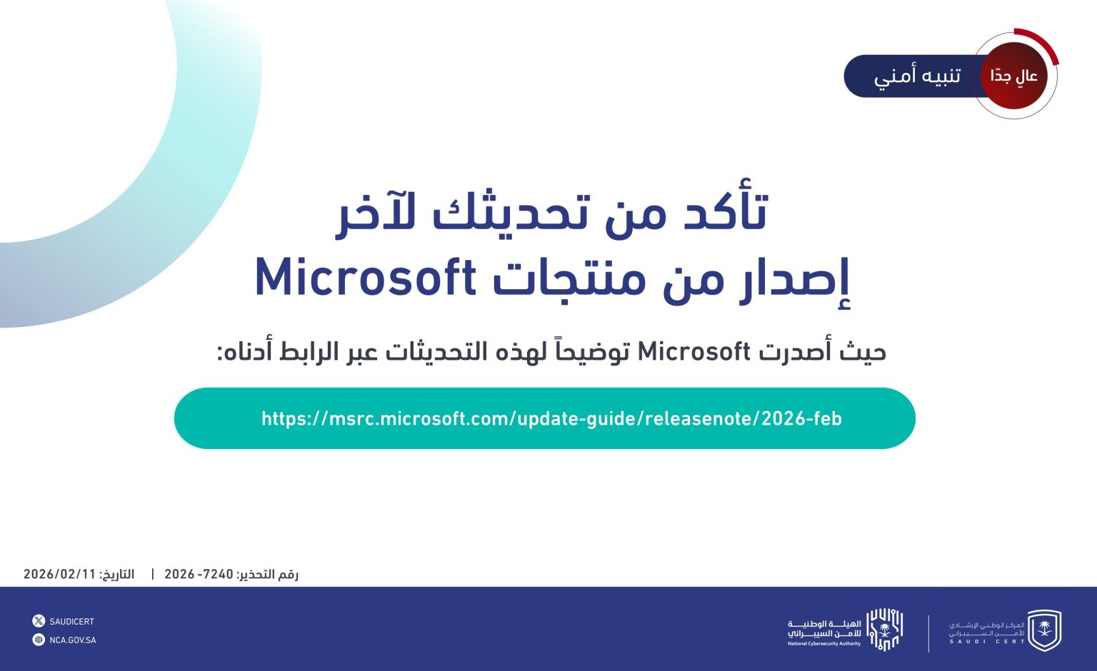 أصدر المركز الوطني الإرشادي للأمن السيبراني (@SAUDICERT) تنبيهًا أمنيًا عالي الخطورة، دعا فيه إلى ضرورة المبادرة بإجراء التحديثات الأمنية الأخيرة على منتجات Microsoft.