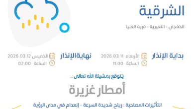 رفع المركز الوطني للأرصاد درجة الإنذار إلى اللون الأحمر في المنطقة الشرقية، محذراً من هطول أمطار غزيرة تستمر حتى الساعات…